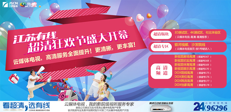 江苏有线,全国率先推出超高清电视服务,成为国内第一家提供高品质超高清直播、点播业务的广电网络公司,全面 引领电视走向高科技、高品质服务的新领域,成为家庭品质视听生活的领导者。南京有线电视用户在家中即可身临其境 地感受“3D至真体验”、“4K炫目试看”、“杜比环绕聆听”、“好莱坞/迪士尼”等家庭影院带来的震撼视听效果, 让精彩真实可碰,质感触手可及。百部大片全免费,千部剧集任您选。