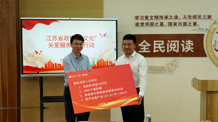 活动现场,书籍与非遗作品传递着知识的力量,连云港分公司广电艺术团送戏下乡的文艺演出,则绽放着群众文化的魅力。作为活动核心支持单位,江苏有线以“科技+文化”的创新模式,向板浦镇群众捐赠总价值129万元的惠民大礼包,包含1000台高清机顶盒及“数字电视+互动+300M宽带”套餐,2000个智能遥控器,5000份高标清付费频道服务等。这些沉甸甸的数字文化福利,将优质视听服务精准送达寻常百姓家,生动诠释了“文化惠民,广电先行”的使命内涵。
